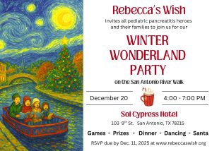 The goal of Rebecca’s Wish is to provide hope to children with pancreatitis, a disease in which the pancreas becomes inflamed. This is a disease that is often misdiagnosed and misunderstood. Through the leadership of Rebecca’s Wish, a team of fellowship-trained surgeons specializing in the field of pediatric pancreatitis have been trained to work with hospitals in San Antonio, New Orleans, Salt Lake City and Seattle. Inpatient/outpatient care, supportive services, and research and development are all foundational principals of this life-saving mission. Rebecca’s Wish wants to champion the fight against pediatric pancreatitis, so that children can finally receive the treatment they desperately need.